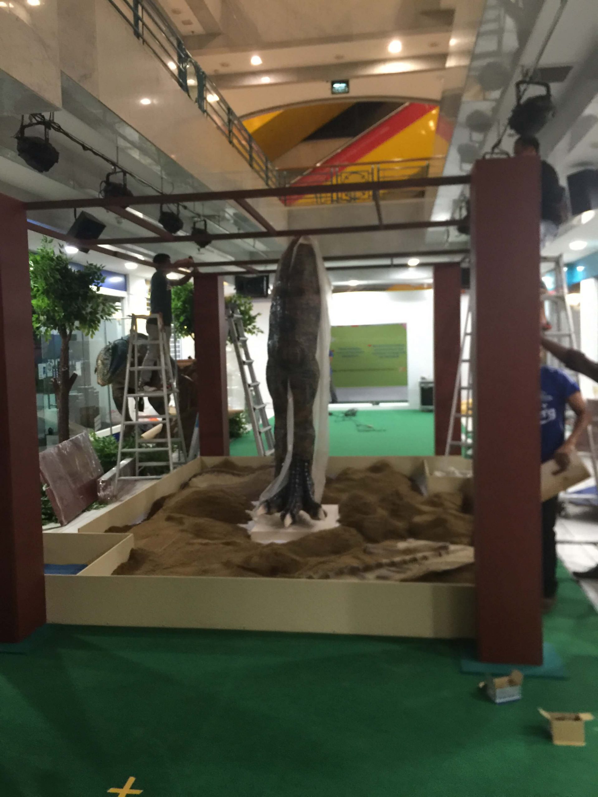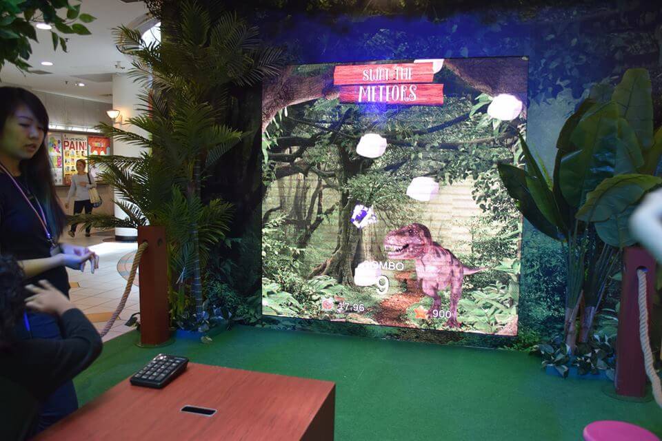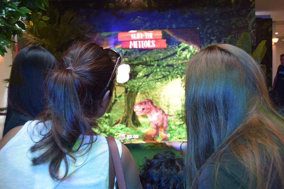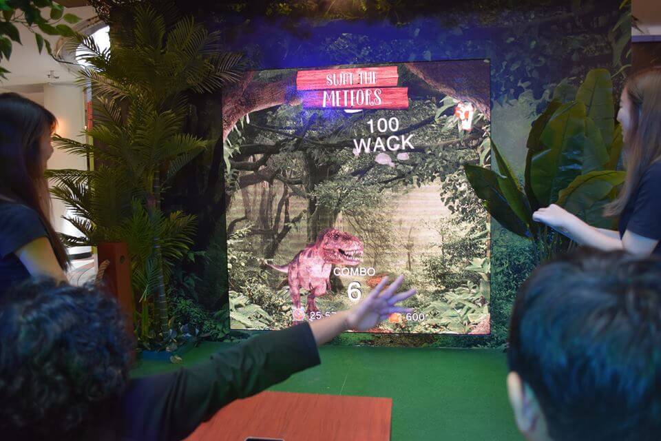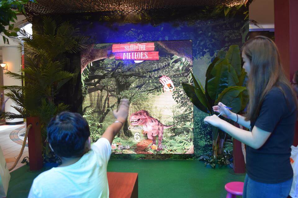 Our Interactive team developed an interactive game with the use of a gesture sensor that detects and tracks players hand motion, this motion is detected and translated into controls that allow them to move the dinosaurs to collect items.